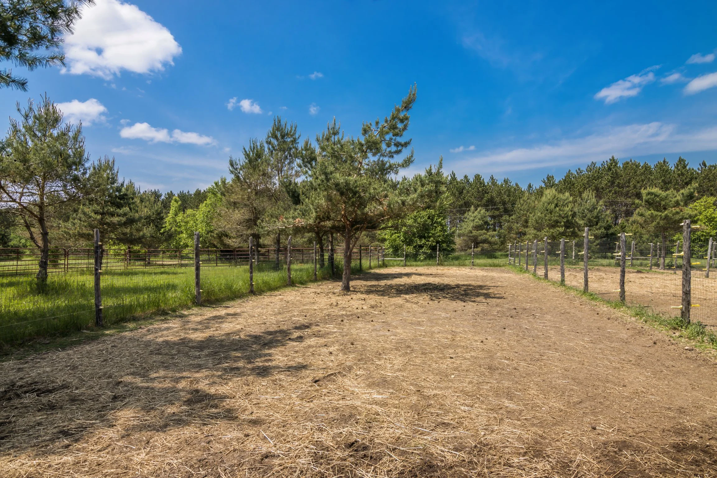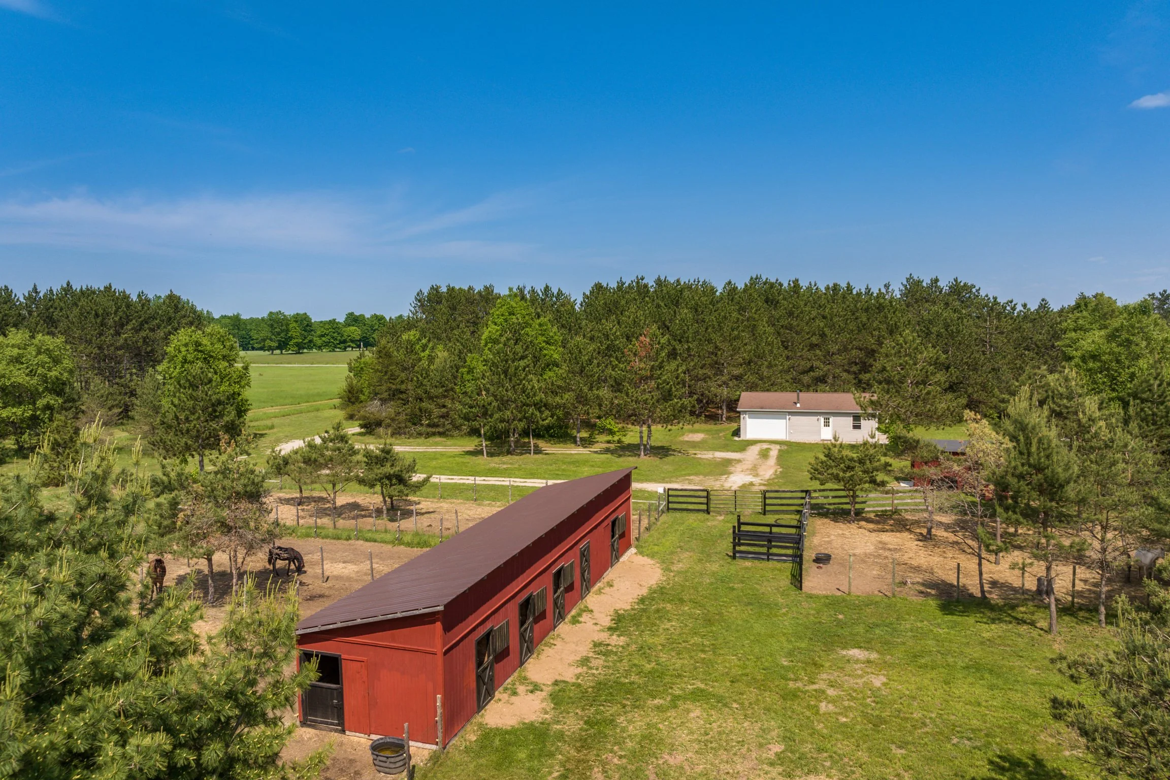 Adorable 2 bedroom home with hickory cabinetry, wood flooring and attached one car heated garage. Custom 6 stall horse barn, with separate paddock for each stall. 30 acres: level, several meadows for pasture, Pines, Hardwoods, fenced garden area, producing fruit orchard. Approximately 9 miles from Kalkaska, 23 miles from Flint Fields Horse Park.