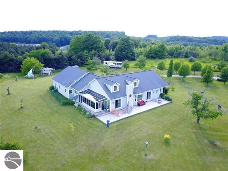Lovely 5 acre rural country setting north of Suttons Bay for this custom designed one level home. Beautiful countryside and water views. This home offers a 24.6 x 9.6 (3-season) sun room; spacious main floor master suite with private bathroom with jacuzzi tub and his/her vanities and closets; 3 car attached garage with deluxe heated 13.5 x 36 shop (hot and cold water) with 15 x 36 overhead bonus room; spacious kitchen with hickory cabinetry and Wilson Art counters; 12 x 12 potting shed; 12 x 24 shed with lean-to addition; wired for generator; 8 zone sprinkler irrigation system; 1000 gallon propane tank; partially finished, poured concrete basement with daylight windows and plumbed for 3rd bathroom. Gardener's delight with two raised garden beds, producing cherry trees, roses, blackberry bushes, perennials and irrigated garden area (8 zones